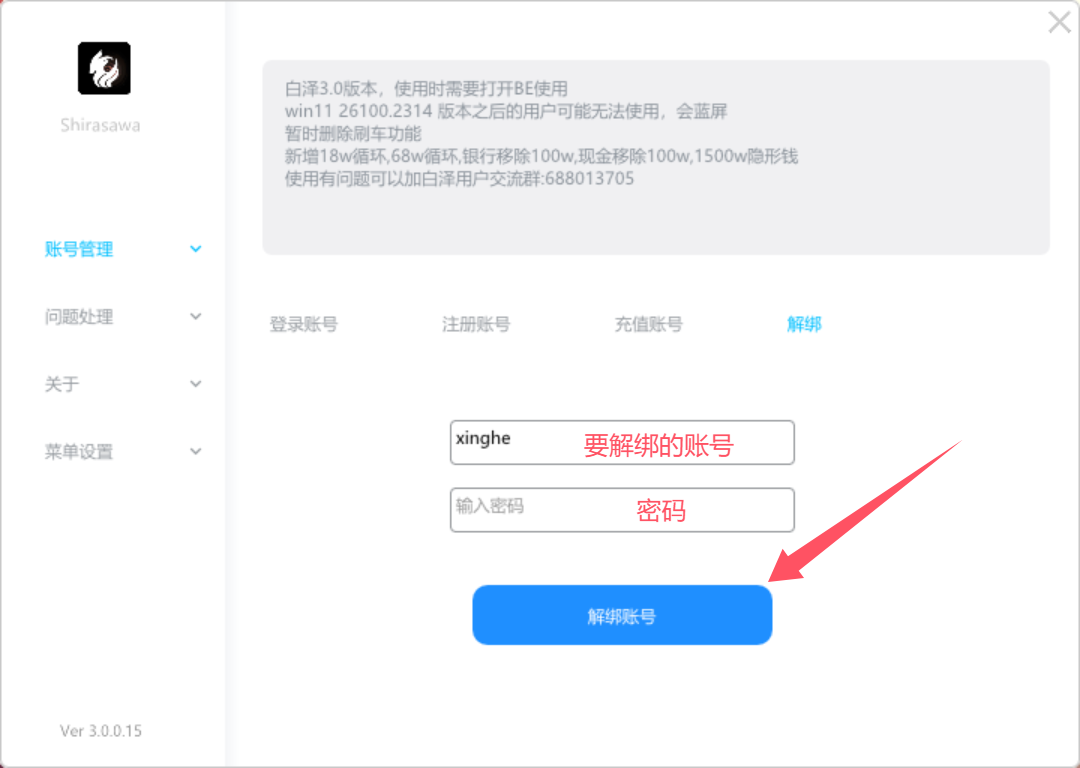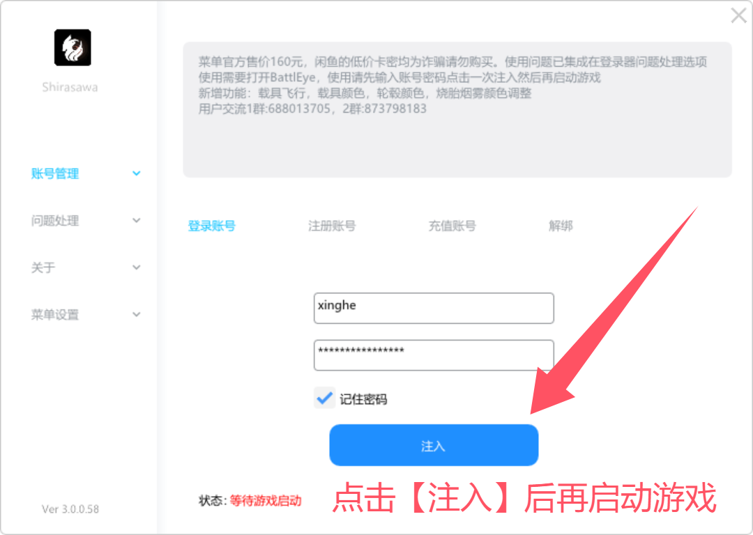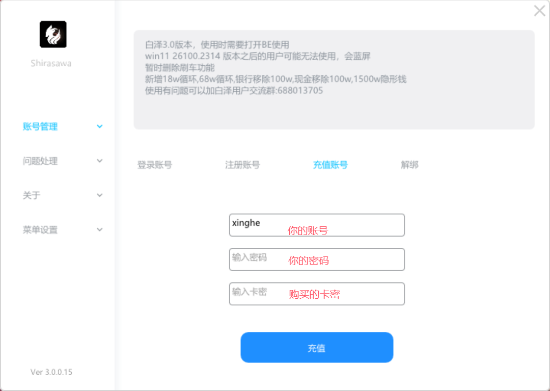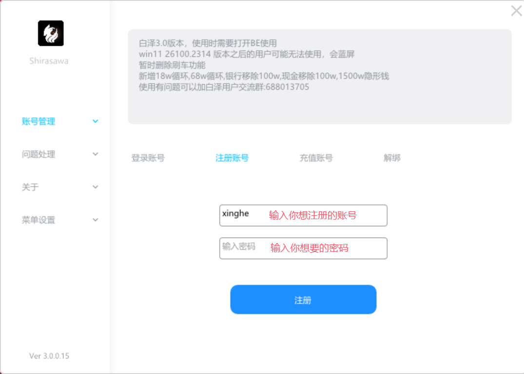 白泽使用教程(传承增强通用) 2025年8月9日 0条评论 618次阅读 0人点赞 xinghe 下载 本地下载 云盘下载 注:用户名不用使用中文和符号 注册 注:图中的账号为示范账号,请填写你自己的账号进行注册 点击【注入】后,进入游戏,等待游戏启动后会自动注入 操作方式 F8呼出/隐藏 鼠标操作 白泽解绑 < 上一篇 下一篇 > 发表回复 取消回复电子邮件地址不会被公开。必填项已用 * 标注* * *