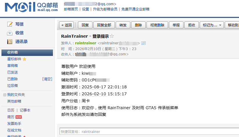 * 用户每次使用,菜单会将登陆器账号密码信息发送到首次使用时的游戏R星账号关联邮箱,你可以在邮件中查看你的及时雨账户信息