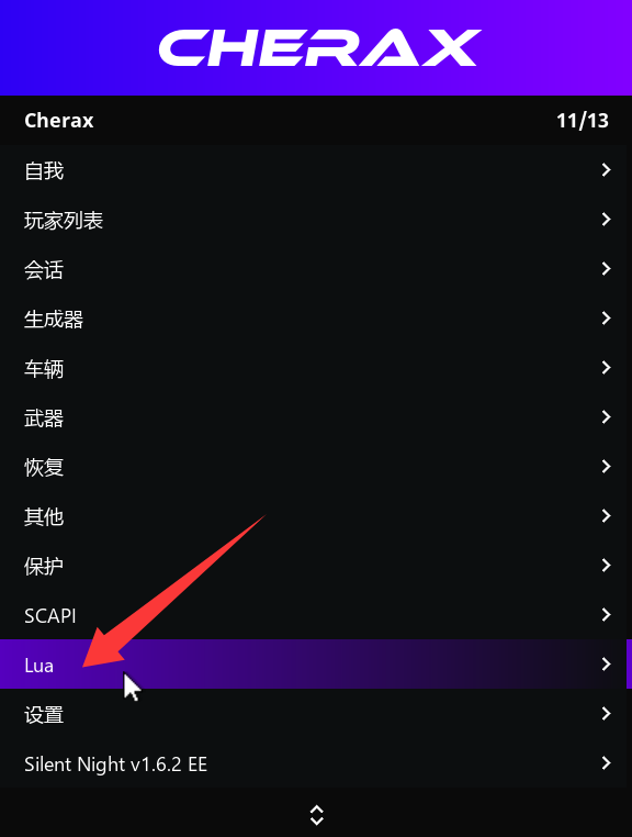 ZT Lua使用教程 2026年3月19日 0条评论 60次阅读 0人点赞 xinghe 下载 云盘下载 请将文件解压并放置在以下路径中:文档\Cherax\Lua 樱桃注入设置-必须切换为列表式图形用户界面(LIst GUI) 当您切换至列表式图形用户界面(ListGUI)后,请在界面中找到并点击“Lua”选项。 点击「本地脚本」 (运行本地存储的ZT脚本文件,请点击此选项。) 切换至ZTlua,然后运行脚本 ctrl+v粘贴购买的ZT卡密,然后点击Login 运行ZTLua_Loader.lua自动设置快捷键【*】启动脚本 下次玩进线上按*即可快速运行脚本 操作方式 鼠标操作 < 上一篇 下一篇 > 发表回复 取消回复电子邮件地址不会被公开。必填项已用 * 标注* * *
